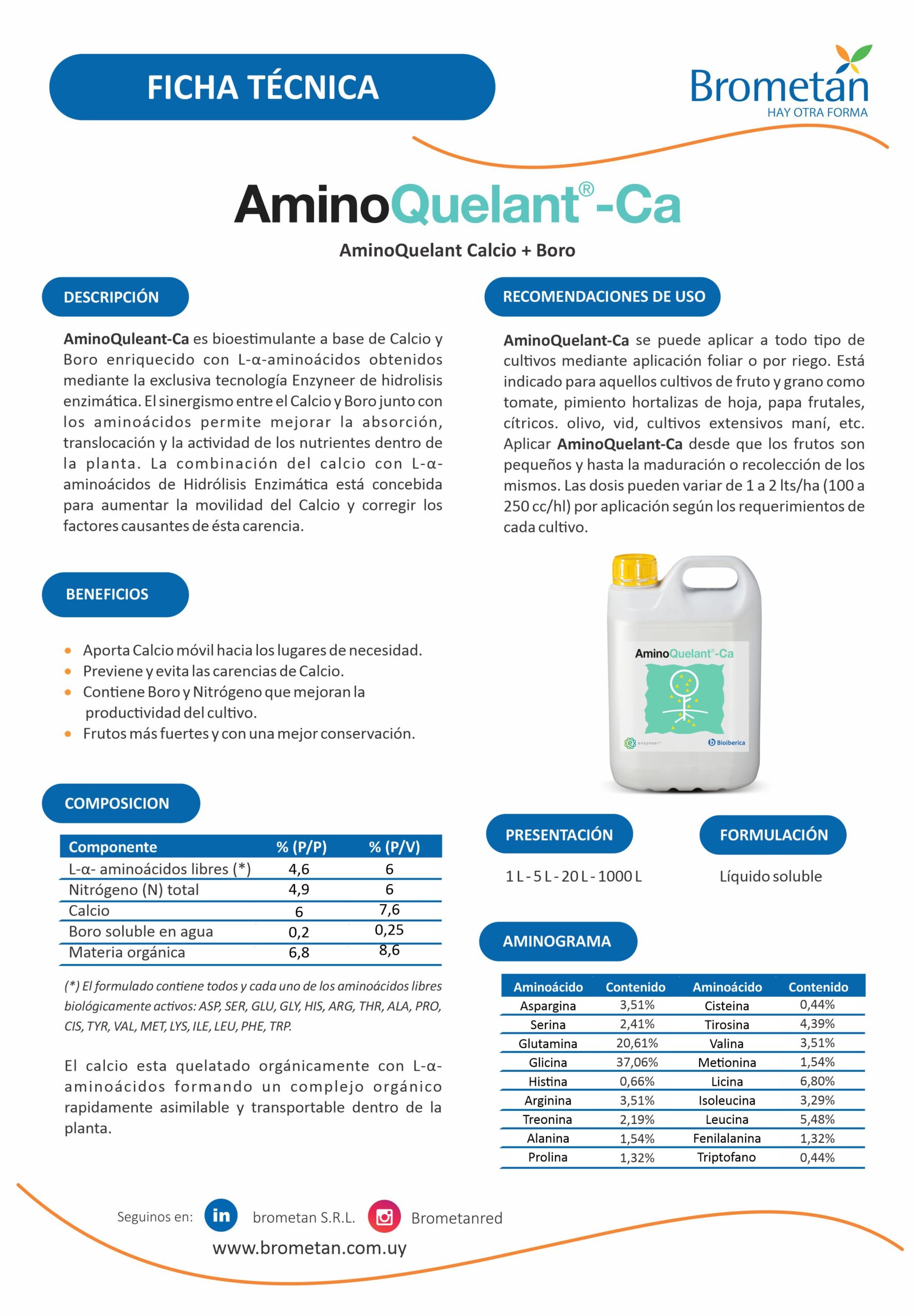 AminoQuelant® – Ca es un producto a base de L-α-aminoácidos obtenidos mediante la exclusiva tecnología Enzyneer. Corrige la deficiencia del elemento Calcio en el cultivo cuando se demanda de manera exigente este nutriente. La formulación de aminoácidos junto con Calcio y otros nutrientes como Boro mejora la movilidad hacia los destinos necesarios del elemento.